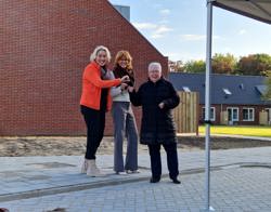 Anita Tijsma overhandigt samen met de wethouder een USB stick aan Annemarie Olinga, één van de nieuwe bewoners. Op de stick staat het time lapse filmpje van de bouw van het hofje. Annemarie kreeg deze als eerste omdat zij bij de start van de bouw, de camera waarmee de film werd gemaakt, mocht onthullen. Annemarie: ‘Ik ben heel blij dat we hier mogen wonen. We verhuizen de 27e. Daar kijk ik enorm naar uit.’